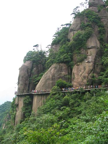 坐索道一下子登上将近1000米的高山,初时未有感觉,风起时感觉凉意才有所察觉。清点完人数后便开始我期待已久的爬山之旅,三清山位于江西省上饶市玉山县与德兴市交界处,为怀玉山脉的主峰。三清山中有玉京峰、玉华峰、玉虚峰三座山峰,因三峰峻拔,犹如道教所奉的三位天尊玉清、上清、太清列坐其巅,故而得名。三清山记录和保存了地球中新生代以来地壳形成演化的历史,特别是完整记录与系统显示了三清山花岗岩地貌的形成过程,是一个具有世界性价值的花岗岩微地貌天然博物馆。我们爬山的路线为是经九天应元府上玉京峰,途经西海岸景区与三清宫,然后经东海岸景区回索道入口。在海拔约1600米的高山悬崖绝壁上,横空出世,向外悬挑出一条全长约3700米,宽1.3米至2米的钢筋混凝土栈道。因其中有2700米不见台阶,宛若玉带,平整如岸,故名西海岸。