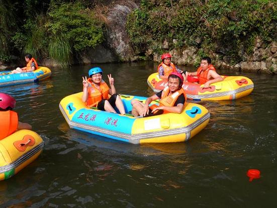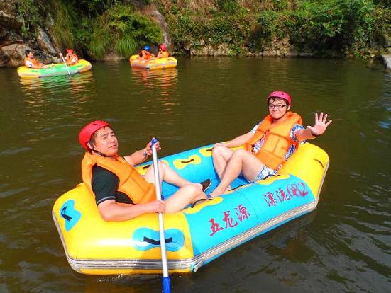 7月26日早上八点公司及家属全员集合后便由导游带路踏上了开往江西婺源的大巴,途中在景德镇小憩片刻后直接来到旅行第一站—五龙源漂流。五龙源漂流全程8.6公里;首尾总落差298米。拥有S型回旋弯道。其中漂流河道分为上下两段,勇士漂长3.8公里,漂程约为一小时左右,猛士漂包含勇士漂长为8.6公里,漂程约为两个半小时左右。在车上时就已统计过漂流人数,我公司群情激燃纷纷选择了勇士漂流。漂完后已是下午,大家回到酒店为明天的爬山养精蓄锐。